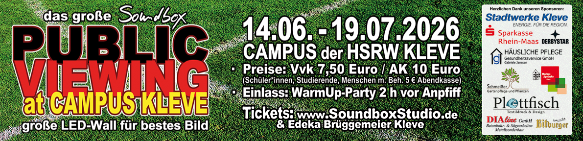 Neben dem Bereich des Tonstudios, veranstaltet die Soundbox Tanz-, Musik- und Comedyveranstaltungen. Darüber hinaus beraten wir unsere Kunden in Fragen des Marketings, Grafik Design und erarbeiten Konzepte und realisieren diese gestützt in unserer kleinen Hausdruckerei. Neben Printprodukten stellen wir auch Großwerbewände in Kreisgebiet Kleve und dem angrenzenden Umland auf.